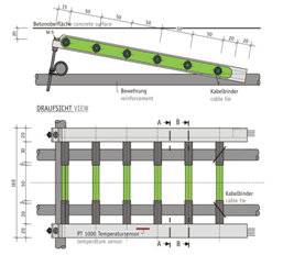 自1990年以來,陽極梯已經(jīng)被各地應(yīng)用于鋼筋混凝土和預(yù)應(yīng)力混凝土結(jié)構(gòu)的銹蝕監(jiān)測。它由6個(gè)鋼質(zhì)陽極、1個(gè)氧化鈦陰極,以及1個(gè)PT1000溫度傳感器組成。鋼質(zhì)陽極裝在不銹鋼框架內(nèi),放置在外層鋼筋與混凝土表面之間的不同深度處。陽極的位置可以在混凝土保護(hù)層內(nèi)調(diào)整。為確保陽極梯能夠進(jìn)行長期監(jiān)測,采用了聚四氟乙烯涂層的電纜,以及電纜長度進(jìn)行了冗余考慮。